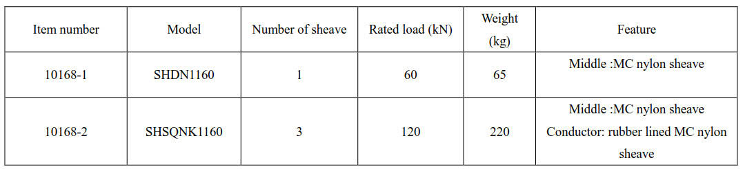 • Dimension of block for conductor ( outside diameter× root diameter × sheave width) Φ1160×Φ1000×150(mm).